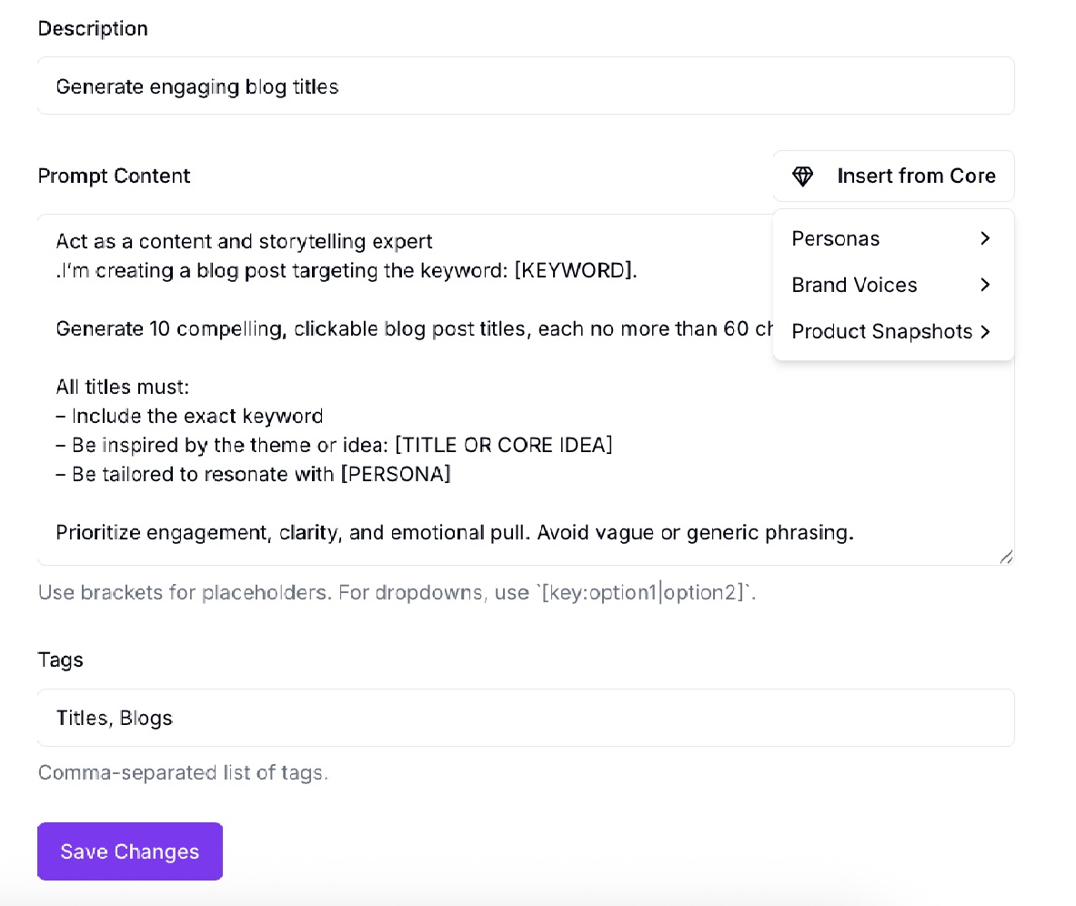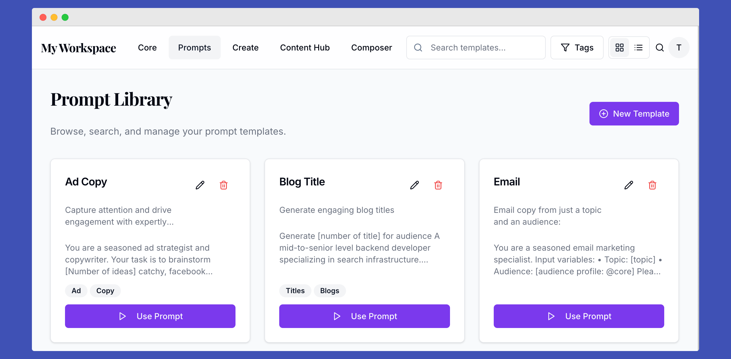 Start with a library of proven prompts or create your own. Turn prompts into templates with dynamic placeholders to easily reuse.