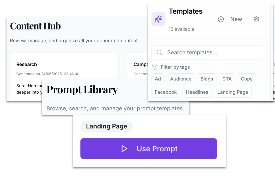 Other tools lock you into rigid templates. Mrkten hands you a dynamic library of reusable prompts with placeholders you control so you reuse the same proven logic across clients, campaigns and industries without recreating wheel after wheel.