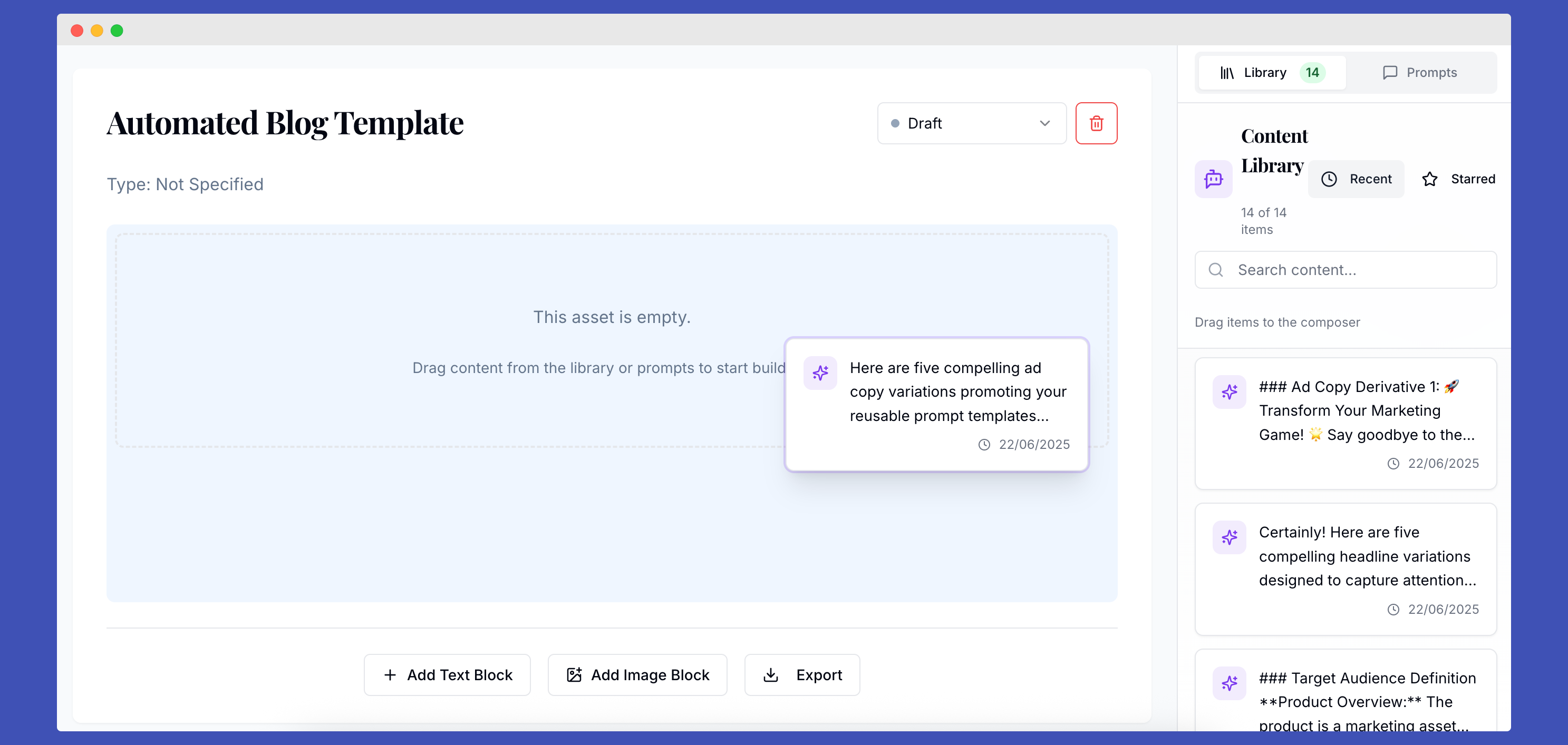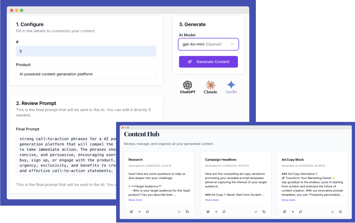 Rapidly customize and generate content from your prompt templates and combine into any assest from ads to whitepapers